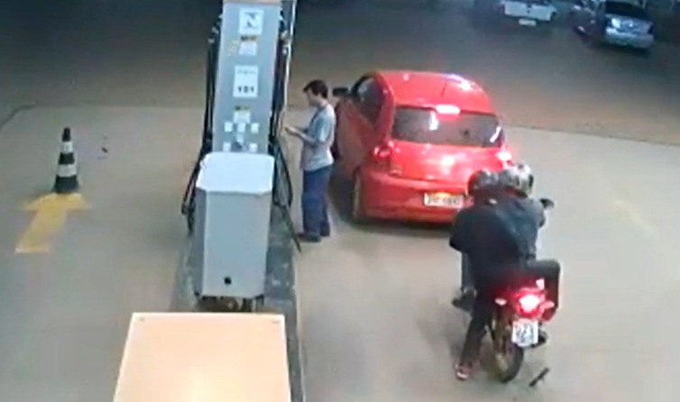 O vídeo mostra quando a dupla de assaltantes chega ao posto de combustíveis, no Setor Norte da cidade, e espera o frentista abastecer um carro vermelho. Assim que o trabalhador termina de cobrar do cliente, o garupa da moto desce armado já ameaçando o atendente.