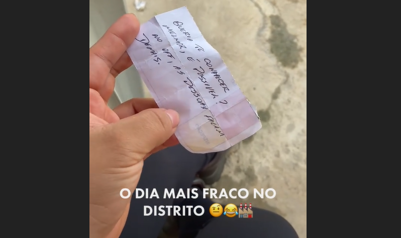 A publicação, que carrega a legenda “O dia mais fraco no Distrito”, exibe a mensagem recebida: “Queria te conhecer melhor, é possível? No off, as pessoas falam demais”. A expressão “no off”, gíria que indica segredo, revela a intenção do remetente em manter o suposto encontro em sigilo. A identidade do autor do bilhete não foi divulgada.