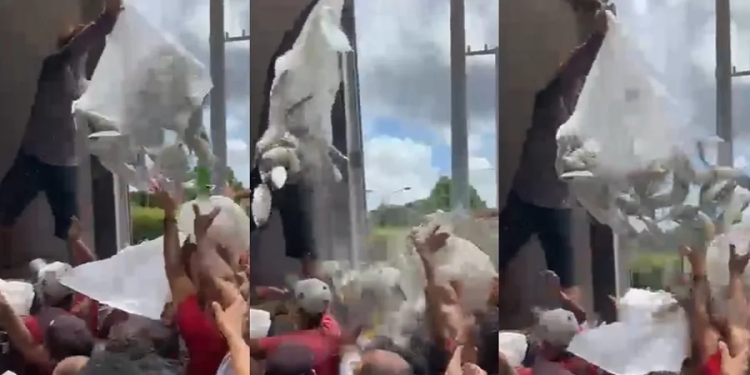 Nas imagens, os funcionários estão dentro de um caminhão baú enquanto a população se aglomera e tenta pegar o peixe, eles então levantam a sacola e jogam o pescado. Como não conseguem pegar os peixes, algumas pessoas se ajoelham catando-os do chão.