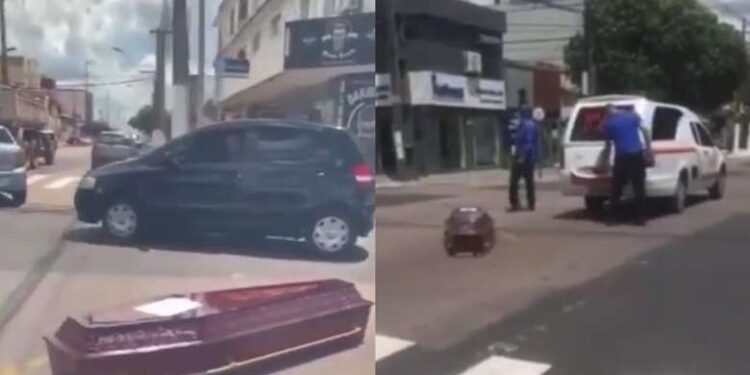 O vídeo, gravado por motoristas que passavam pelo local com câmera de celular, mostra o carro funeral seguindo após deixar o caixão caído na via.