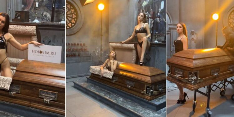 RÚSSIA | Uma funerária na Rússia gerou polêmica nas redes sociais ao usar modelos de lingerie durante um ensaio fotográfico com poses sensuais em meio a caixões e urnas funerárias. O vídeo dos bastidores da sessão foi divulgado nas redes sociais da empresa.