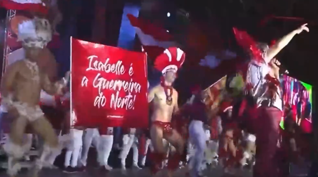 Leonardo Castelo começou a cantar a toada “Isa A Bela” e os membros do Garantido levantaram uma frase com a faixa: “Isabelle guerreira do Norte”. O cantor falou que a cunhã-poranga seria a ganhadora do Big Brother Brasil e deixou o público eufórico.