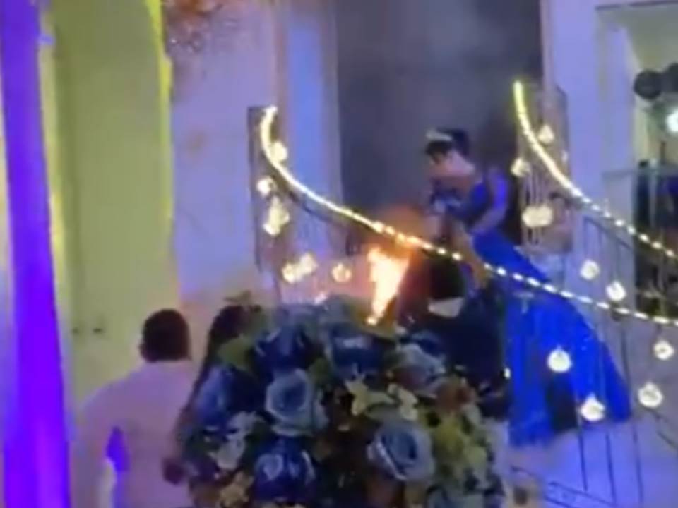 MANAUS (AM) – A estudante Bianca Macanoni passou um susto durante sua festa de debutante que ocorreu nesta sexta-feira (12), na Zona Sul de Manaus. O vestido longo, azul, que nem de princesa, para os seus 15 anos, pegou fogo enquanto ela descia uma escada e se apresentava aos convidados.