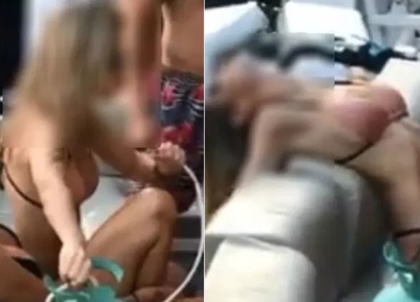 Em um vídeo divulgado nas redes sociais uma moça cercada por amigos aparece ajustando o botijão e levando uma mangueira até a boca. Confira: