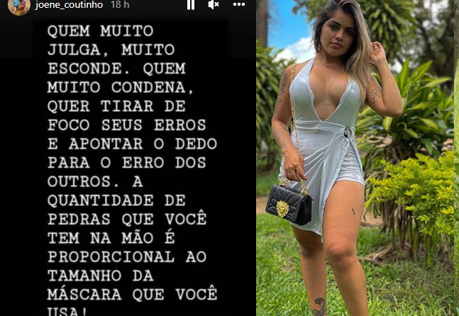 Na segunda-feira (23), Joene seguiu com as indiretas. “Quem muito julga, muito esconde. Quem muito condena, quer tirar de foco seus erros e apontar o dedo para o erro dos outros.”