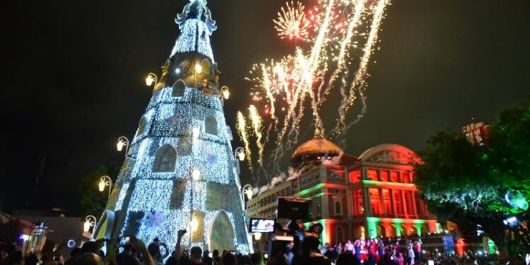Manaus – Com fanfarra, brincadeiras, inauguração da Árvore de Natal e Casa do Papai Noel, Feira de Artesanato e Gastronomia, música e pirotecnia, o Governo do Amazonas abriu, na noite deste sábado (07/12) a programação “Presente de Natal”, no Largo de São Sebastião. Participaram do evento o governador em exercício, Carlos Almeida Filho, e o secretário estadual de Cultura e Economia Criativa, Marcos Apolo Muniz.