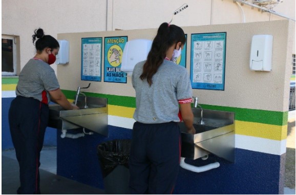 As pias estão sendo colocadas em pontos estratégicos das escolas e deverão ser utilizadas para a higienização correta das mãos, com sabão e toalha de papel, por alunos, professores, pedagogos, gestores e demais integrantes da equipe escolar, conforme estipulado pelo Plano de Retorno às Atividades Presenciais da Secretaria de Educação, disponível no link: https://bit.ly/2Dzgah6.