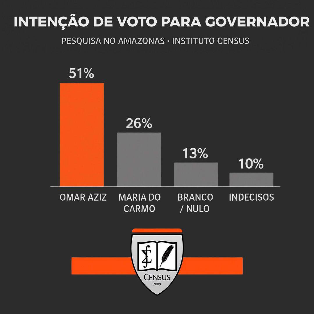 Na avaliação geral, Omar Aziz aparece na frente com 51% das intenções de voto, o que corresponde a 66% dos votos válidos. O senador demonstra vantagem no interior, onde registra 68% das preferências, e na capital, com 40%. Maria do Carmo ocupa a segunda posição, com 26% no total — equivalente a 34% dos votos válidos. A pesquisa ainda revela que 13% dos entrevistados estão indecisos, e 10% afirmaram que votarão em branco ou nulo.