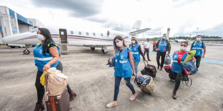 MANAUS – AM | Mais 13 profissionais da saúde chegaram a Manaus nesta quinta-feira (23/04), enviados pelo Ministério da Saúde, através do programa Força Nacional do SUS. São quatro médicos, dois fisioterapeutas e sete enfermeiros. Os profissionais devem atuar no Hospital Delphina Aziz, referência no tratamento da doença na capital. No dia 16 deste mês, o Estado já havia recebido os primeiros 17 médicos e enfermeiros, dos quais quatro continuam atuando em Manaus.