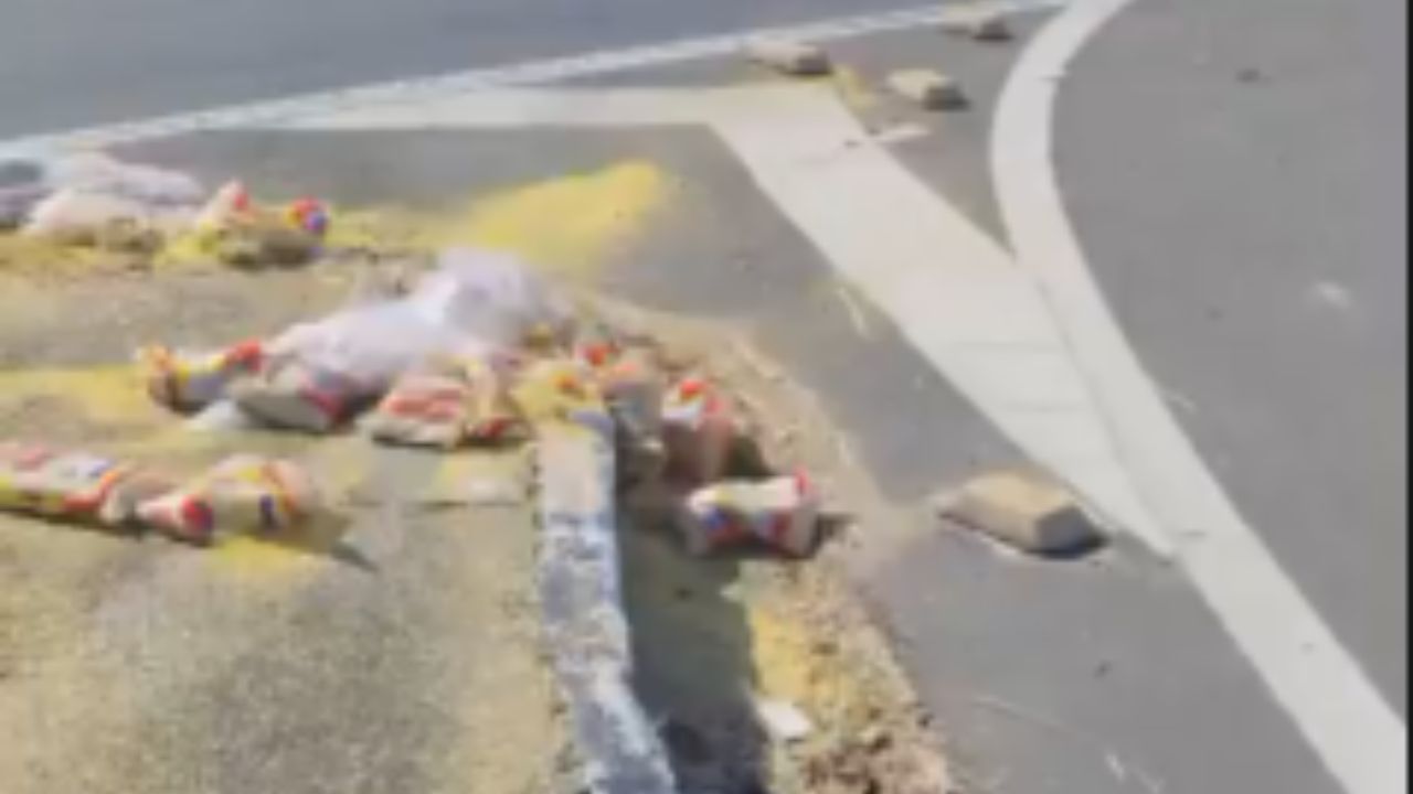 Imagens feitas por uma testemunha mostram o produto espalhado no asfalto e rapidamente viralizaram nas redes sociais. Em tom de ironia, a pessoa que grava diz que é “grãos de ouro”.