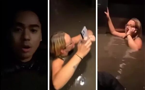 “Assim que [a água] chegou à barriga, pensamos, ‘OK, isso é real’”, disse Luu à ABC News. “Era como algo saído de um filme”, continuou. Os vídeos produzidos pelos amigos mostram o elevador dando um solavanco e sendo tomado pela água, que entrava pelo piso e pelas portas fechadas.