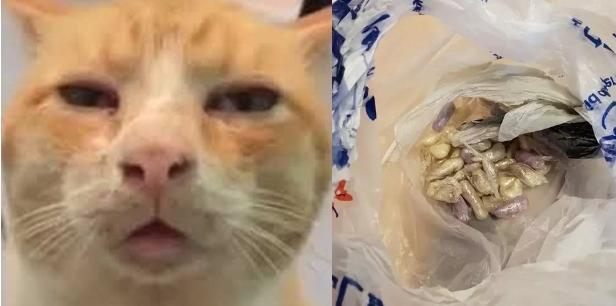 Os tutores do felino disseram que o medo foi grande quando viram 30 trouxinhas ao lado do gato, dentro de uma sacola, enquanto ele dormia tranquilamente.