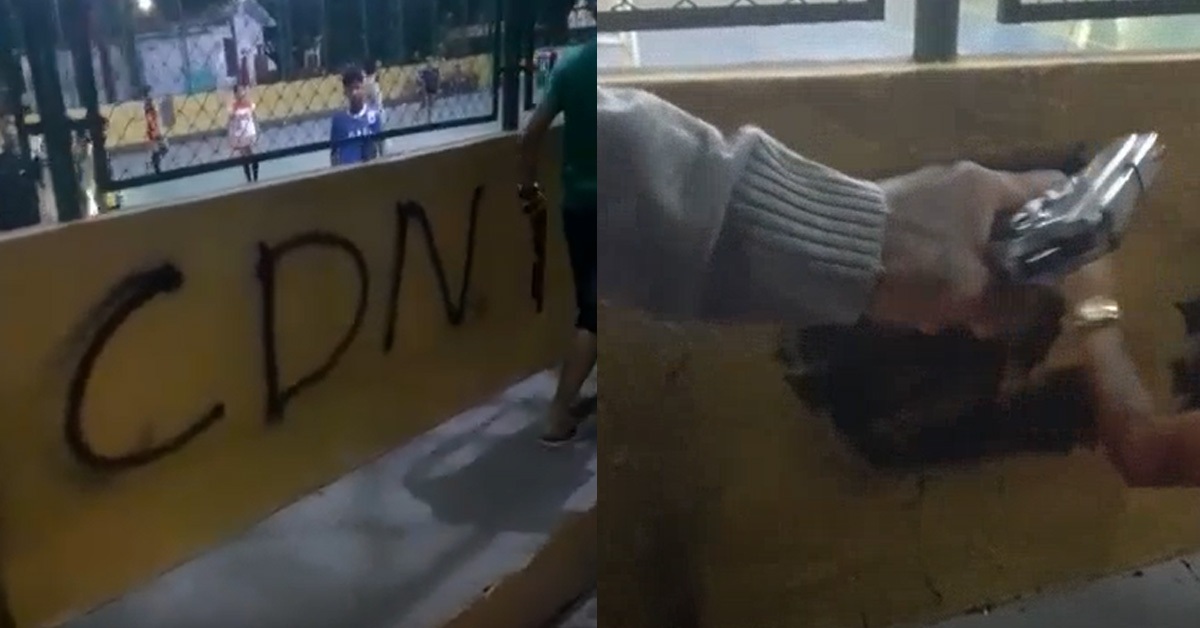 No vídeo, os bandidos chegam na frente da quadra, onde jovens e crianças estavam jogando bola, e amedrontam pessoas dentro do local. “Agora é CDN”, gritam eles após marcar a quadra esportiva e fugir.