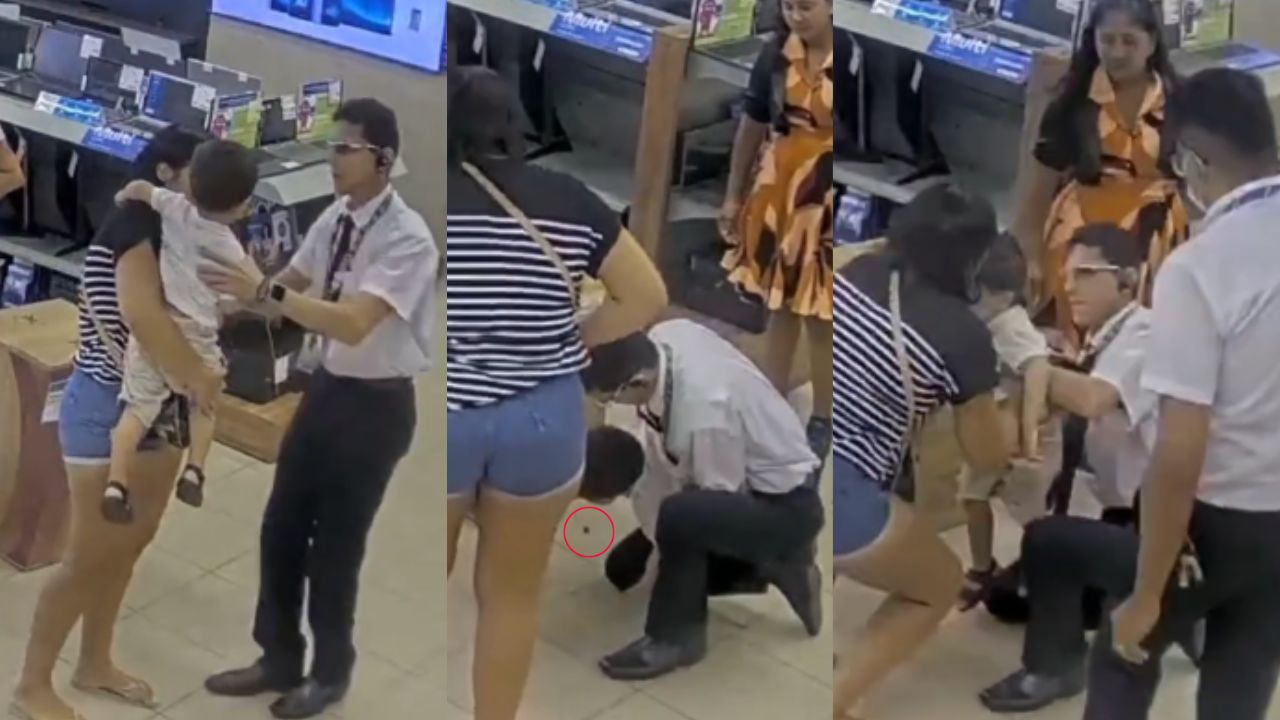 A cena mostra uma mãe segurando uma criança pedindo ajuda ao funcionário. Na mesma hora, ele pega o menino, faz uma manobra de desengasgo e o salva. O que estava preso na garganta da criança aparece caindo no chão.