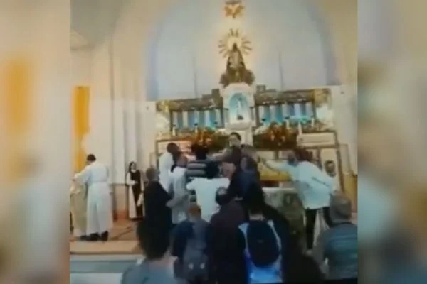 Enquanto o padre falava no púlpito, um homem de blusa branca aparece correndo pelo meio da igreja e avança em direção ao religioso. No mesmo instante, fiéis tentam tirar o agressor e impedir o ataque. No vídeo, é possível ouvir gritos pela igreja.