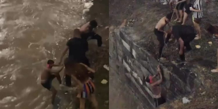 Os foliões usaram uma corda para resgatar o jovem, que não foi identificado.
