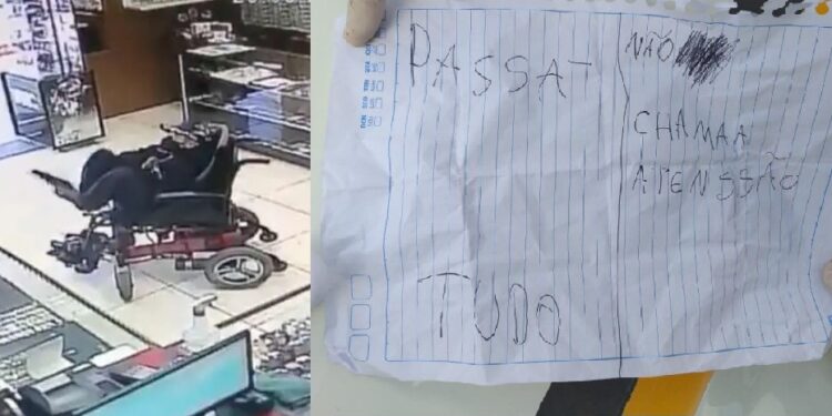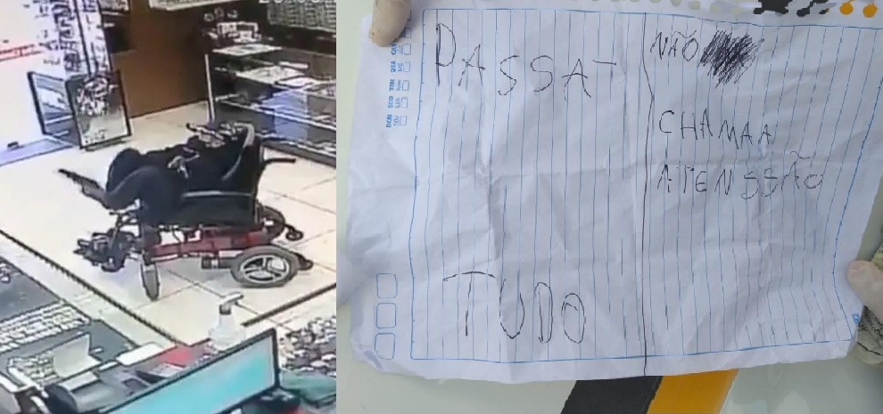 Alguns minutos depois, o rapaz passou ao comerciante uma folha arrancada de caderno. “Passa tudo. Não chamaa atenssão (sic)”, estava escrito no papel. O empresário achou se tratar de uma brincadeira, até que o assaltante sacou uma arma com os pés.