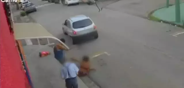 Enquanto a mulher está sendo agredida, um carro que estava estacionado sai do local e por pouco não passa em cima dos pés da vítima.