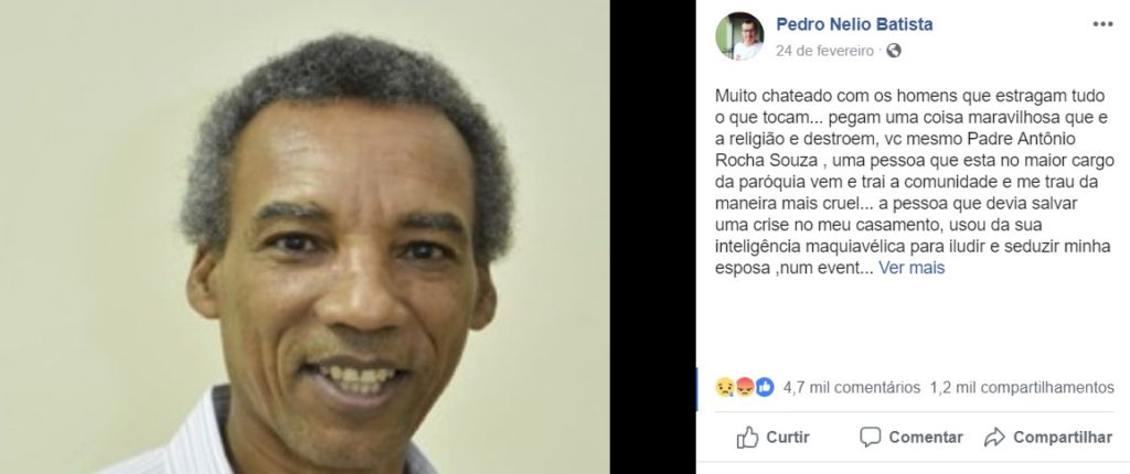 No relato, Pedro destaca que a traição aconteceu após ele procurar o padre para rasolver uma crise no meu casamento, e que o sacerdote acabou usando a sua inteligência maquiavélica para iludir e seduzir sua esposa, num evento religioso, conhecido como festa da padroeira, em meados de 2018.