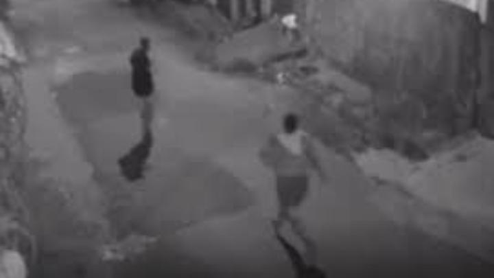 No vídeo, a mulher aparece correndo atrás do homem identificado apenas como Leandro, que cai e acaba golpeada. A jovem usou a faca da cozinha para aplicar três golpes na vítima.