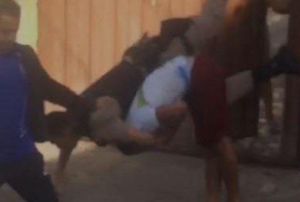 Quando o suspeito consegue se soltar um pouco do policial, ele desfere um golpe de luta e joga o militar ao chão. O homem foge e os populares em volta comemoram.