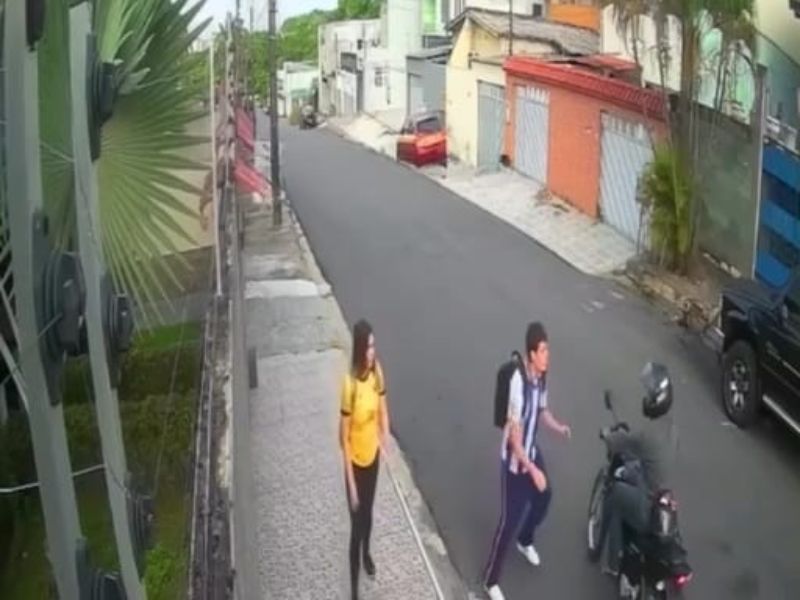 Nas imagens, é possível ver o momento em que o suspeito se aproxima de um casal que caminhava pela rua. Ele estava em uma motocicleta e tenta abordar as vítimas, mas o homem reage, empurrando o suspeito do veículo. Em seguida, os dois entram em luta corporal.