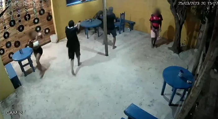 Toda a ação foi flagrada por câmeras de segurança do estabelecimento e mostram a vítima bebendo ao lado de um rapaz e uma moça. De repente, uma dupla de encapuzados invadiu o local e disparou diversas vezes na direção de Fabrício.