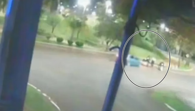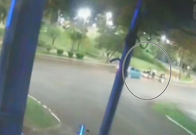 As imagens de segurança mostram a vítima apoiada em uma motocicleta estacionada, conversando com um amigo, quando um carro avança contra ambos. Após a colisão, o motorista, identificado como ex-namorado da jovem, desce do veículo e foge a pé. A Polícia Militar foi acionada via 190 e encontrou a jovem com escoriações pelo corpo. O amigo também sofreu ferimentos leves.