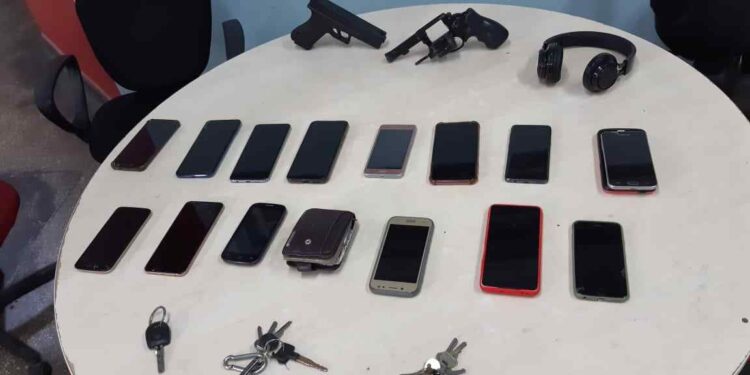Os policiais detiveram um suspeito, alvejado com um disparo na perna direita, e com ele encontraram um revólver calibre 38 com três munições intactas e duas munições deflagradas, além de um simulacro tipo pistola, e mais 14 aparelhos celulares. Os outros dois suspeitos fugiram do local.