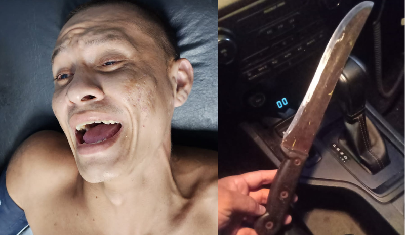 “Tentamos conversar com ele no momento em que ele estava em uma rede. Quando a gente deu voz de prisão pra ele, ele pulou na minha direção com o facão. Eu consegui me defender e imobilizá-lo, mas a gente ficou rolando no chão e ele a todo tempo tentando me esfaquear. Meu parceiro teve que utilizar a arma e dar um tiro nele”, contou.