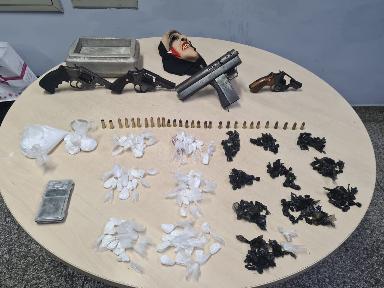 Após vistoria na casa onde os suspeitos estavam, os policiais encontraram outras duas armas de fogo calibre 38, uma submetralhadora, de fabricação caseira, calibre 9 milímetros, 10 munições calibre 38, 19 munições calibre 9 milímetros, porções de cocaína, oxi e maconha, além de material para o embalo da droga.