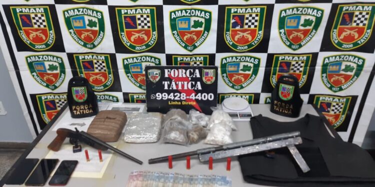 Ao total, na ação, foram apreendidos uma arma de fogo caseira calibre 28, uma espingarda calibre 36 com duas munições, um colete balístico, dois tabletes de maconha, três porções grandes de maconha, 22 trouxinhas de maconha, 50 trouxinhas de merla [subproduto da cocaína] e 111 pedras de oxi, além de três aparelhos celulares e dinheiro.