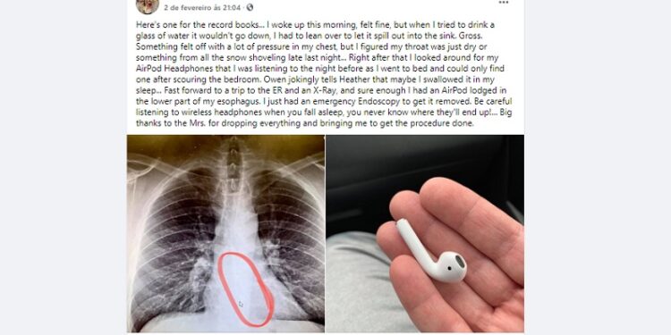EUA | Na última terça-feira (02), um homem chamado Bradford Gauthier engoliu um dos AirPods, fone de ouvido da Apple, enquanto dormia. O caso aconteceu em Massachusetts, nos Estados Unidos. De acordo com as imagens de raio-x, o acessório estava alojado em seu esôfago, e foi necessário realizar uma endoscopia de emergência para retira-lo do corpo.
