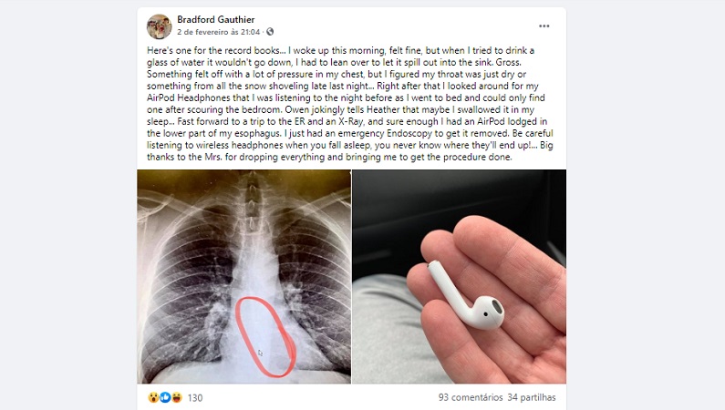 EUA | Na última terça-feira (02), um homem chamado Bradford Gauthier engoliu um dos AirPods, fone de ouvido da Apple, enquanto dormia. O caso aconteceu em Massachusetts, nos Estados Unidos. De acordo com as imagens de raio-x, o acessório estava alojado em seu esôfago, e foi necessário realizar uma endoscopia de emergência para retira-lo do corpo.