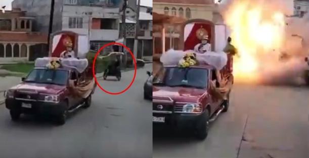Imagens gravadas do momento, mostram o homem segurando vários artefatos explosivos que seriam acendidos durante a procissão. Ele chega até a acender um, mas a faísca acaba pegando em todos causando a explosão.