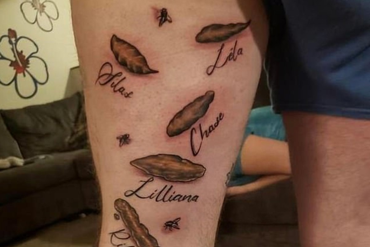 MUNDO | Um homem resolveu compartilhar no Reddit uma “singela” homenagem feita especialmente para seus filhos. por causa de tatuagens inusitadas na perna esquerda. O usuário decidiu tatuar desenhos de “cocô’ na perna esquerda e colocar, em cada um, o nome de cada um dos seus filhos.