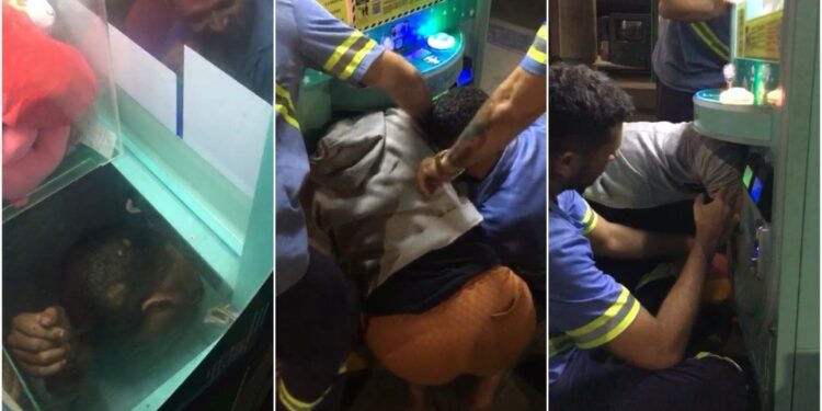 As imagens gravadas no momento do incidente mostram o homem sentado no chão com a cabeça presa em uma extremidade da máquina, por onde saem as pelúcias pegas pelos usuários.