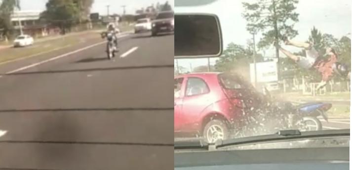 PARANÁ| Nesta segunda-feira (9), um vídeo de um acidente envolvendo uma motocicleta e um carro, repercutiu nas redes sociais. Um homem que estava filmando o trajeto de carro, acabou flagrando um motoqueiro fazendo uma manobra arriscada com seu veículo e acabou provocando uma grave colisão.
