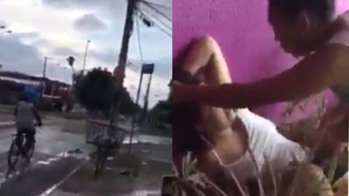 Cenas gravadas mostram o homem fugindo de bicicleta do motel, enquanto uma das três mulheres, que acompanha a esposa do rapaz, grita: “Vai nego safado, corre mesmo, safado, vagabundo!”.