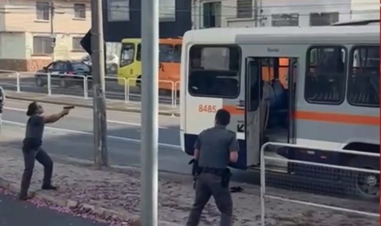 Imagens que circulam em redes sociais mostram o homem realizando os ataques e PMs chegando ao local para rendê-lo e realizar a prisão.