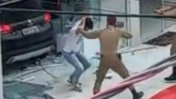 O vídeo gravado por pessoas que passavam pelo local mostra o homem tentando acelerar o veículo depois de ter invadir o salão de beleza onde estava a ex-mulher.