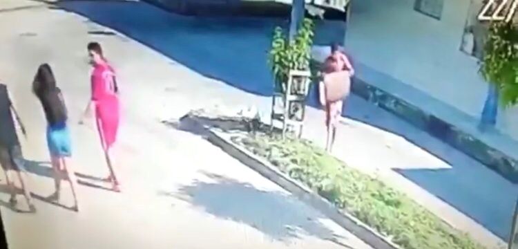 Câmeras de segurança do local captam o momento exato em que o suspeito de cometer o assassinato descarta uma caixa com roupas da vítima ensanguentadas no canteiro central de uma rua da cidade.