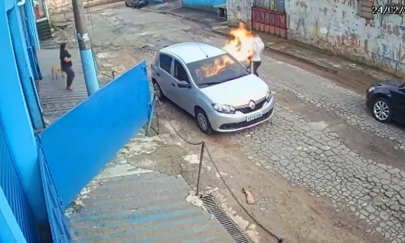 Uma câmera de segurança registrou o crime. A vítima estava deixando a esposa no trabalho, quando Celsa se aproxima com um produto inflamável em um copo e joga contra Fabricio.