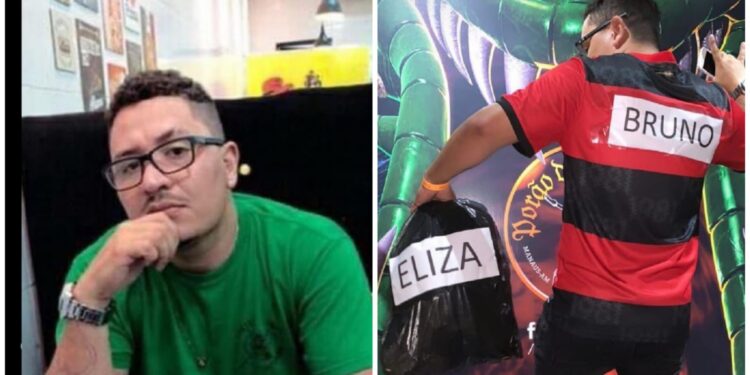 Rodrigo Fernandes foi ao evento vestido com uma camisa do Flamengo, escrito ‘Bruno’ e segurando um saco plástico escrito ‘Eliza’, fazendo referência ao crime que chocou o país há 11 anos.