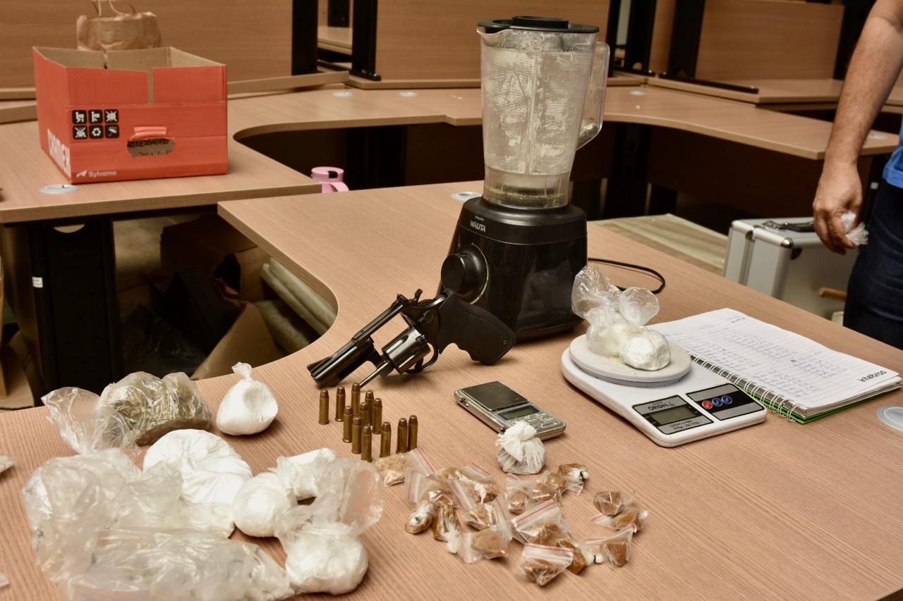 Durante diligências, foram apreendidas drogas tipo maconha, cocaína, oxi e ecstasy, um revólver calibre 38, munições e outros materiais utilizados para o tráfico de drogas.