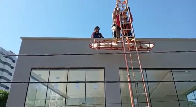 O homem estava há mais de 5m de altura no momento do acidente. Uma equipe do Corpo de Bombeiros especializada em Salvamento em Alturas, foi chamado para resgatá-lo.