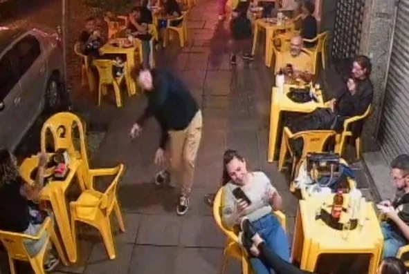 Nas imagens, é possível perceber o momento em que Stracke balança os braços e levanta da cadeira tentando se livrar do inseto. Os outros frequentadores riem e ninguém o ajuda, só ficam olhando.