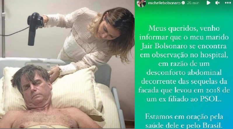 “Meus queridos, venho informar que meu marido Jair Bolsonaro se encontra em observação no hospital, em razão de um desconforto abdominal decorrente das sequelas da facada que levou em 2018 de um ex-filiado ao PSOL”, escreveu, fazendo ainda pedidos de oração pelo ex-presidente e “pelo Brasil”.