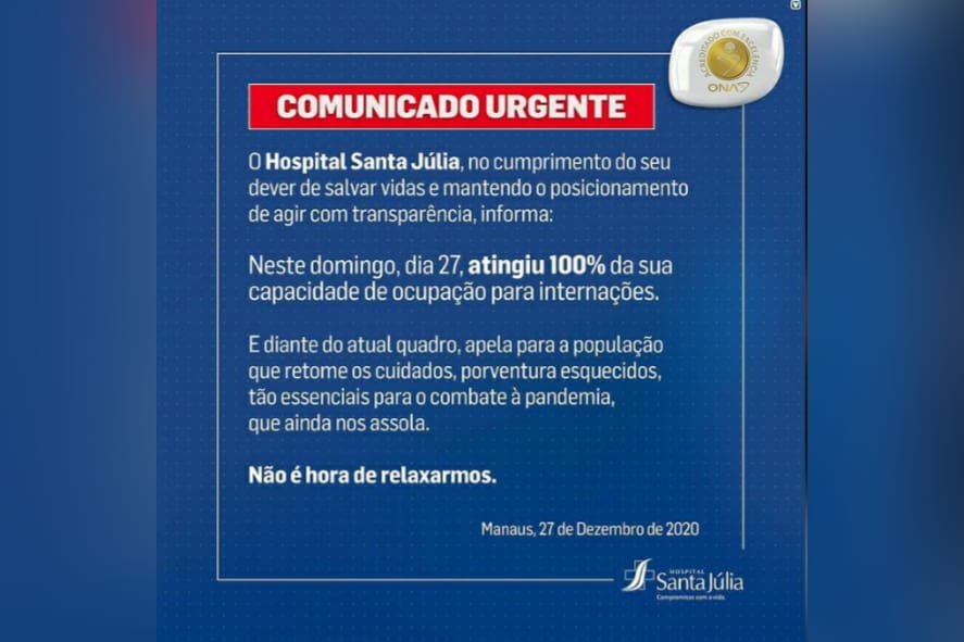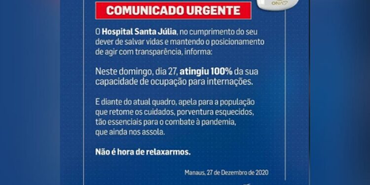 MANAUS – AM | O Hospital Santa Júlia informou neste domingo (27), através das redes sociais, que atingiu o limite de ocupação de leitos dedicados à Covid-19.