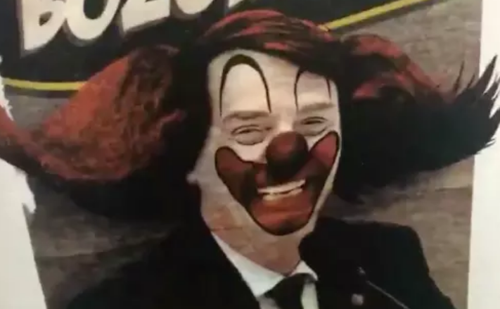 A estampa da peça traz Bolsonaro como um palhaço (o palhaço Bozo, mais especificamente) e o número eleitoral 66.666.